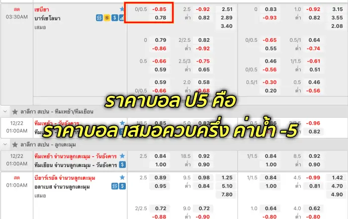 ราคาค่าน้ำ ลบห้า มันจะแปลกตรงที่ว่าค่าน้ำทีมต่อนั้นจะได้เต็ม เนื่องจากว่าโดยส่วนใหญ่แล้ว ทีมต่อนั้นจะได้ค่าน้ำไม่เต็มนั่นเอง เพราะฉะนั้นเล่นราคานี้ ก็ต้องคิดให้เยอะๆหน่อยนะครับ หรือเจอกับ ราคาบอล ต่อ ป ก็ต้องดูค่าน้ำให้ดีๆด้วยเช่นกัน