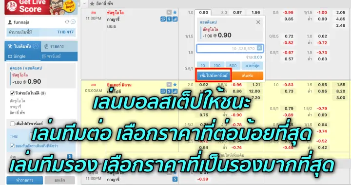 ขั้นตอนการแทงมันไม่ได้ยากเลยครับ เพียงแค่ท่านนั้นเลือกราคาในการเล่นของบอลคู่ที่ท่านอยากจะแทง จากนั้นก็เลือก พาร์เลย์ เอาได้เลย มันจะขึ้นเป็นการแทงบอลสเต็ปให้ท่านไดเทันที จากนั้นก็เลือกทีมที่เหลือ โดยขั้นต่ำในการแทงบอลสเต็ป มันอยู่ที่ 2 คู่ เท่านั้น